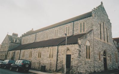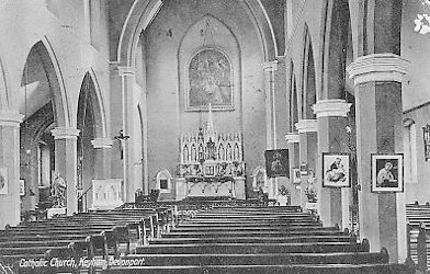 From a postcard. From 1859 the Admiralty provided an old hulk, formerly "HMS Hotspur", later renamed "Monmouth", which was moored in the Hamoaze as a Chapel to enable sailors and priests to observe Mass. As the Royal Dockyard expanded so the hulk was moved upstream towards Saltash. It became a long way for the sailors to row so the Admiralty approached Bishop Vaughan. The Lord Saint Levan offered land and the Admiralty gave £500 towards the building. A Miss Ellis, who had come to Plymouth from Hayle for health reasons, gave £5,000. Bishop Graham, Coadjutor Bishop of the Plymouth Diocese, laid the foundation stone on Wednesday April 10th 1901. The service was attended by seventy bluejackets from the Royal Naval Barracks, under Lieutenant Humphries, and members of the Roman Catholic Cathedral's Young Men's Club., wearing their green sashes. Bishop also took the first service to be held there on the morning of Sunday July 6th 1902. The Church was designed by the Reverend Canon A J C Scoles and was built of limestone, in the Gothic style, dressed with Bath stone. It was said to measure 120 feet by 50 feet. There were seats of pitch pine for some 550 people and an oak altar. Mr Robert George Jenkins, of Marlborough Street, Devonport, erected the building at a cost of £5,000. A Presbytery was due to be ready in time for the formal opening of the Church in September 1902. It was expected to cost £1,200. The priest was the Reverend Patrick Kent, the brother of the Reverend T P Kent, the priest at the Roman Catholic Church of Saint Michael and Saint Joseph at Devonport. Our Most Holy Redeemer was reduced to a burnt out shell during the night raid of Monday/Tuesday April 22nd/23rd 1941. Exactly a week later the Presbytery met the same fate. Two of the classrooms on the ground floor of the school were turned in to a temporary chapel. It was rebuilt in 1954 and re-consecrated on Wednesday April 10th 1957. During the ceremony of dedication, the Roman Catholic Bishop of Plymouth, the Right Reverend Cyril Restieaux, congratulated Monsignor Canon Gaynor, who had been the parish priest since 1924, on his development of the parish, part of which was transferred in 1935 to the Roman Catholic Church of Saint Paul the Apostle at Saint Budeaux, and the erection of a secondary school at Keyham. The Bishop consecrated both the outside and inside walls of the Church and the High Altar, while Monsignor E Dewey, a former Royal Naval Chaplain, consecrated the Altar of the Sacred Heart and the Abbot of Buckfast, the Right reverend Dom Placid Hooper, did likewise with the Altar of Our Lady. In the evening they all attended a celebratory dinner at the Goodbody's Café in New George Street, Plymouth. Attached to the Church is a house for the Sisters of Charity of Saint Paul the Apostle.