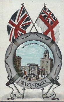 From a postcard. Although the Royal Navy had been present in the Plymouth area for centuries, they had only used Plymouth Sound or Barn Pool, off Cremyll, for mooring and the Cattewater for repairing and cleaning their vessels. The Admiralty set up a Naval Victualling Office on the Barbican at Plymouth to supply their warships and feed their sailors. It was not until the French opened a naval dockyard across the English Channel at Brest that a need was seen for an English equivalent and the Hamoaze, between Devon and Cornwall, was seen as the ideal location. The first stone dock was built at Point Froward in the Hamoaze in 1691 and over the next three centuries the Royal Navy took over the whole of the waterfront from Devil's Point (Royal William Victualling Yard) through the Gun Wharf, the Keyham Steam Yard, the North Yard Extension, and the Royal Naval Barracks, until it eventually engulfed reclaimed land for the Royal Naval Armament Depot at Ernesettle. In charge of all the Royal Navy establishments from Exmouth westwards to Penzance was the Commander-in-Chief, Plymouth Command (except between 1845 and 1896, when it was Commander-in-Chief, Devonport) until that post was discontinued in 1970. In 1939 that post was held by Admiral Sir Martin Eric Dunbar-Nasmith VC KCB. Under his command came the Admiral-Superintendent of the Royal Dockyard, a post held in 1939 by Rear-Admiral Arthur N Dowding CB; the Commodore of the Royal Naval Barracks, Rear-Admiral A T B Curteis; the Surgeon-Rear-Admiral of the Royal Naval Hospital at East Stonehouse (Surgeon-Rear-Admiral G F Synms FRCS LRCP); the Engineer-Captain in Charge of the Royal Naval Engineering College (Commander (Engineering) W L Spear; the Captain in Charge of the Royal Naval College, HMS "Britannia" at Dartmouth (Captain F H G Dalrymple-Hamilton) and the Commandant of the Plymouth Division, Royal Marines, equivalent to a Royal Naval Commodore, at the Royal Marine Barracks, East Stonehouse, which in 1939 was Brigadier Harold George Grant. Over those three hundred years and more the Royal Navy establishment in Devonport, under the Commander-in-Chief at Admiralty House (1795), Mount Wise, now an extinct posting, has been composed of: -