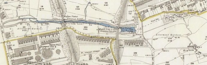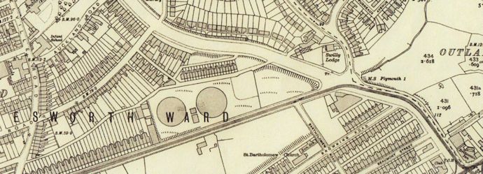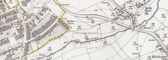 Levan Road, 1892. Ford Leat is clearly shown in the above map extract, again from 1892, covering the land soon to become the eastern end of Saint Levan Road, between Ford Hill and Wolseley Road.