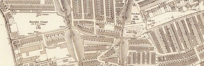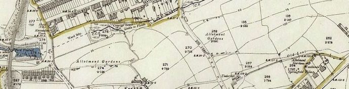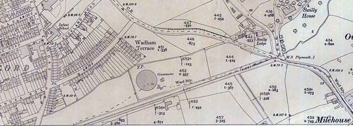 Western end of Saint Levan Road, 1914. By the time of this map, surveyed in 1912 and published in 1914, the last few houses at the western end had been completed and the Allotment Gardens had become the Royal Naval Engineering College's Recreation Ground. The houses between the two viaducts (numbers 70 to 99, running westwards) had also been built the spare land beside the London and South Western Railway's viaduct had become the Rocky Hill Recreation Ground. The tramway along Saint Levan Road was constructed by Devonport Corporation under their Act of 1900. They then handed it over to the Devonport and District Tramways Company, who operated the services, on August 23rd 1904. However, there were no houses beyond Ford Hill at that time.
