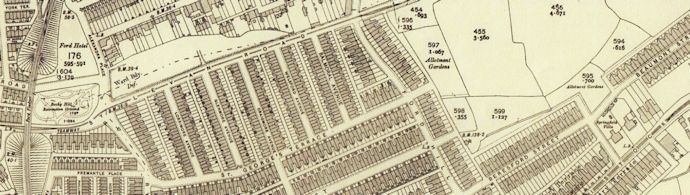 streets on the southern side of Saint Levan Road had been built. The extension of Saint Levan Road from Ryder Road eastwards to Wolseley Road was completed by the addition of the streets running up to Saint George's Terrace. Note the long back gardens running southwards from Seaton Place: part of these were used for the five properties of Strathbrook Terrace, the one next to the Ford Palladium Cinema being a fish and chip shop.