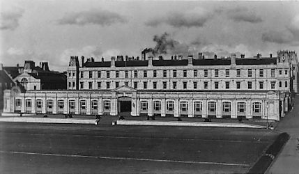 Shed overlooking the Parade Ground. Allegedly at one time known as "The Indoor Parade Ground Building", the Drill Shed at the Royal Naval Barracks was designed by Superintendent Engineer, Lieutenant-Colonel P Smith, Royal Engineers, and formed part of the original Barracks. It was doubled in size in 1907. Historic England state that it is constructed of Plymouth limestone ashlar over a steel frame. The iron-trussed flat roof is supported on iron pillars. The frontage contains a central exit down steps on to the Parade Ground. The two side elevations have two entrance/exits each. The interior can usually be viewed during Navy Days as it is then filled with static displays.