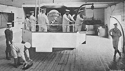 Dinner time at the Royal Naval Barracks. HMS "Vivid" itself was sold and moved to Glasgow in November 1912 and when the Great War started Johnston Terrace Elementary School was taken over to provide extra accommodation for sailors. Helping to support the wives of sailors while they were away at sea were the many local branches of the Royal Naval Friendly Union of Sailors' Wives. Devonport's first "Navy Week" took place in August 1928, publicized by the Barracks' Bluejacket Band marching around Devonport, Plymouth and East Stonehouse, while in October the former cinema and beer hall was converted into a theatre.