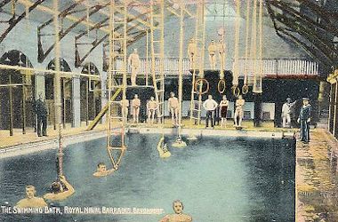 The Swimming Bath at the Royal Naval Barracks. A swimming bath was officially opened in May 1905 and a gymnasium in 1906. In February 1907 the Anglican Church of Saint Nicholas was dedicated and the new guardhouse was completed. Later that year the new Gunnery School was officially opened. During 1907 the Drill Shed was doubled in size.